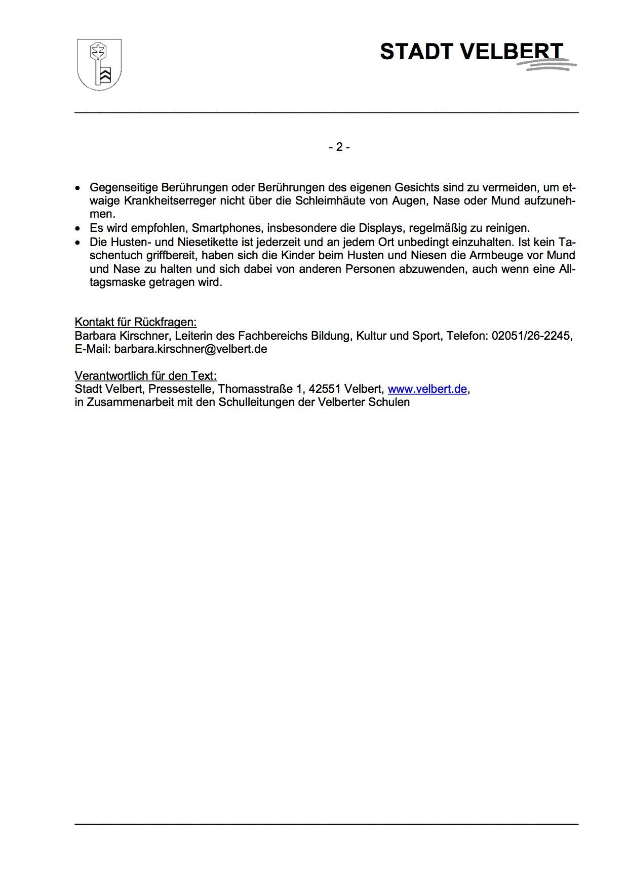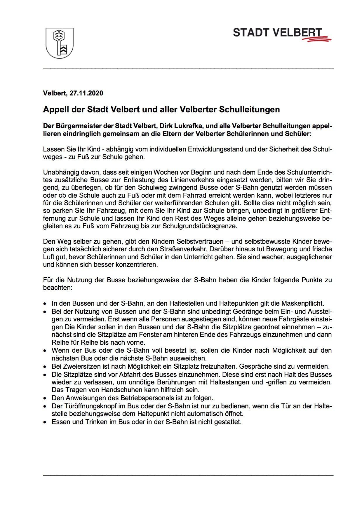 anbei erhalten Sie einen Appell der Stadt Velbert und aller Schulleitungen an alle Velberter Familien im Umgang mit dem Schulweg Ihrer Kinder.